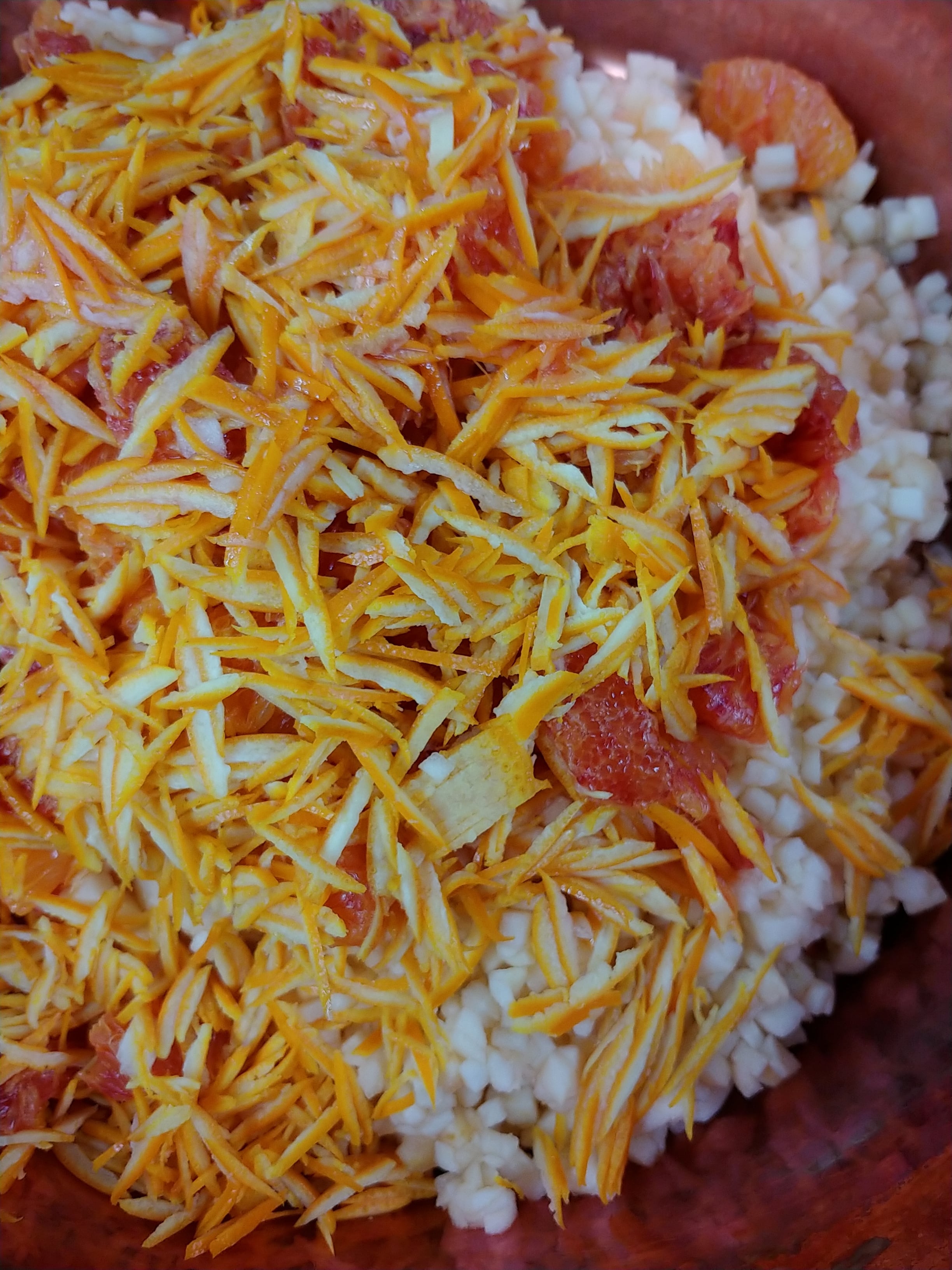 角切りりんごと、スライスしたオレンジの